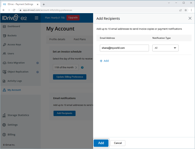 Can I add an email recipient to my IDrive® e2 account for receiving invoices and payment emails?