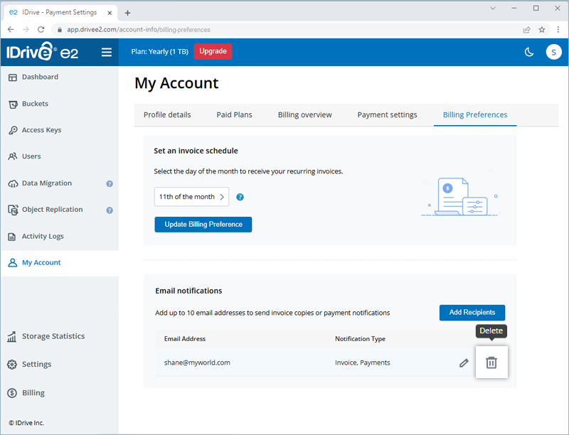 faq Can I add an email recipient to my IDrive® e2 account for receiving invoices and payment emails?